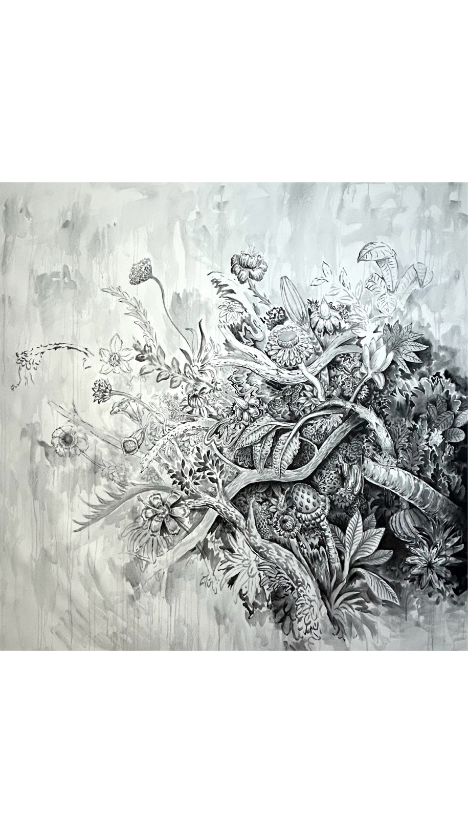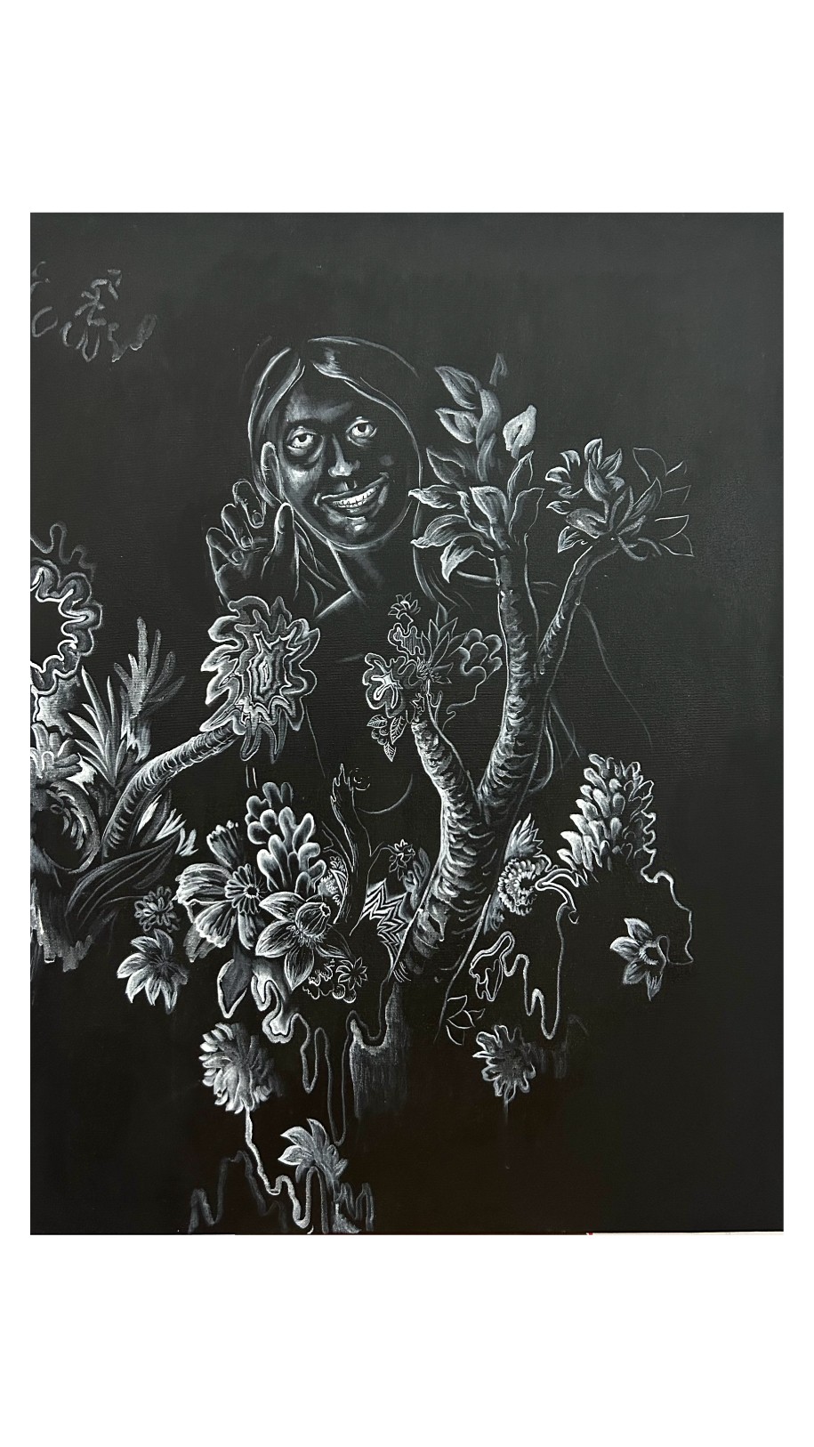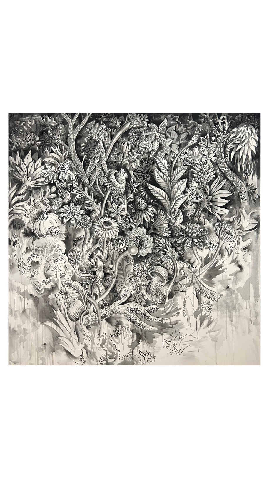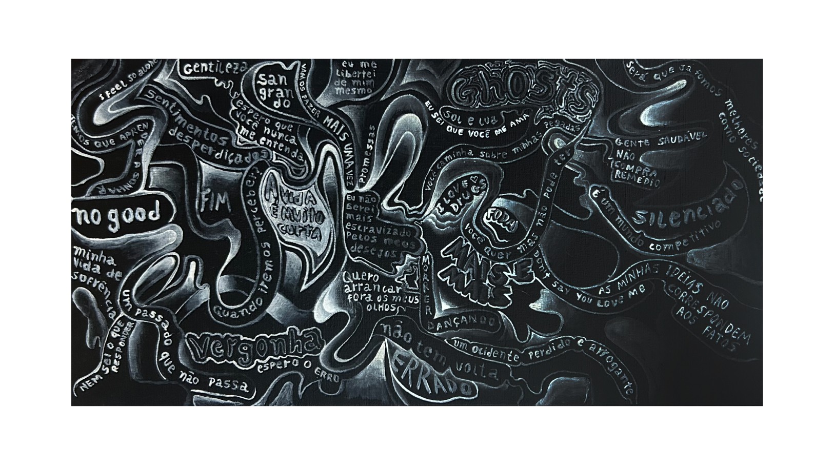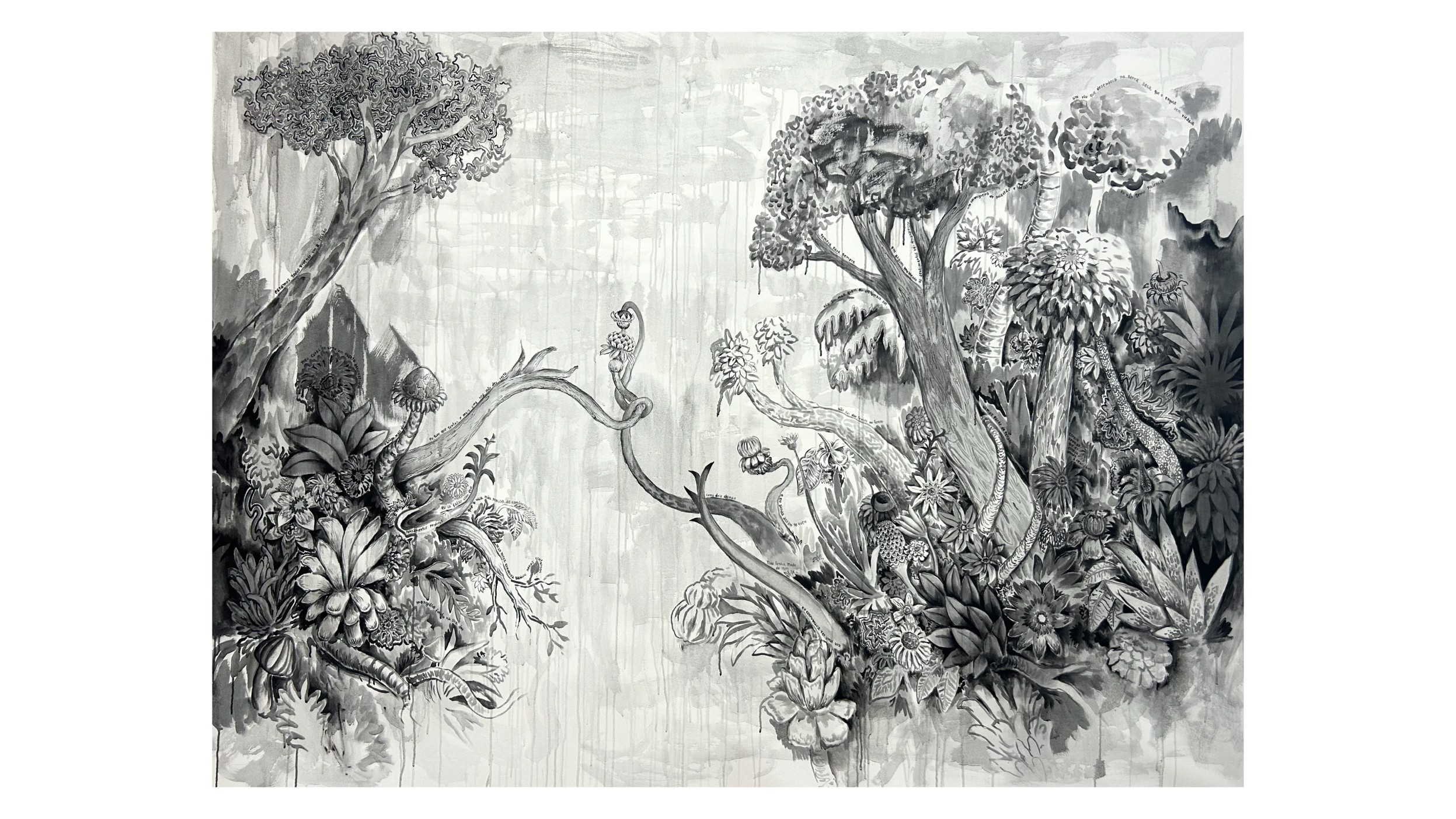 Florestas com ares de sonhos e contos de fadas são invadidas por formigueiros de palavras, que se dispersam sobre caules e plantas, evocando encontros efêmeros, desejo e perda. Flores se projetam em busca de sol, em pinturas com aspecto de trabalho em construção. Plantas incorporam o espírito humano, na procura por uma identidade tropical latino-americana, analogia à nossa natureza interior. Figuras fantasmagóricas provocam o espectador. Há ainda aparições inesperadas: pequenas figuras históricas que invadem a cena, captadas apenas pelo olhar mais atento - Tarsila do Amaral, Dom Pedro, caravelas portuguesas, pirâmides mesoamericanas.