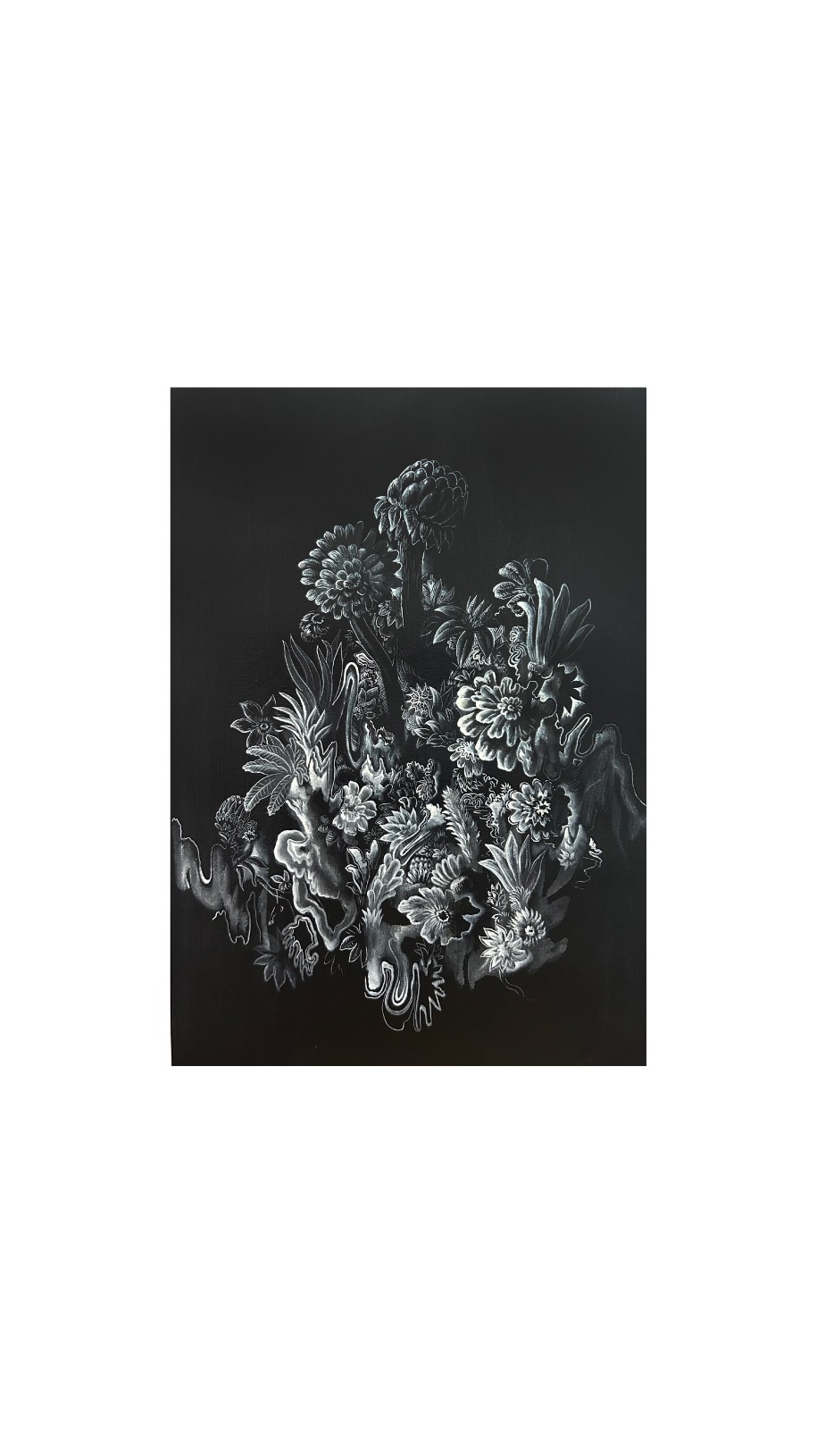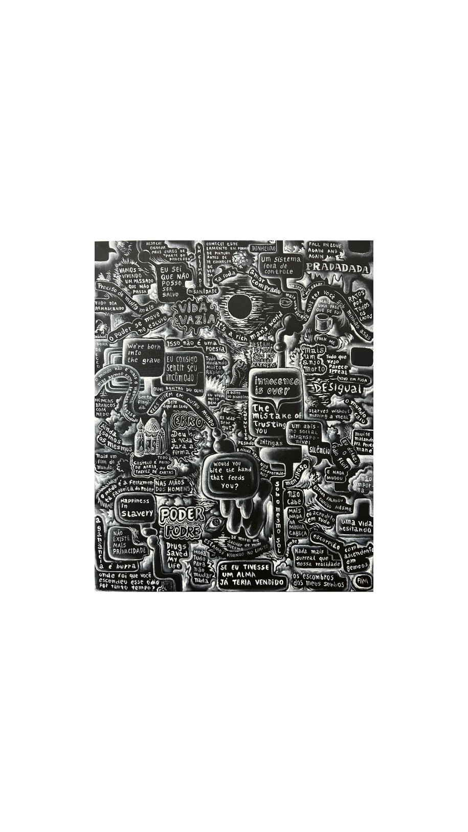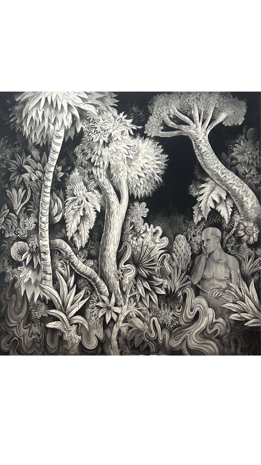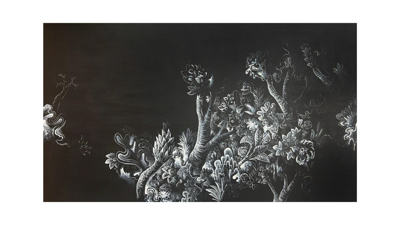 Unindo o humor ácido de sua série de recortes e memes a uma releitura das pinturas de florestas psicodélicas tropicais, agora em paleta preta e branca, o artista apresenta um universo simbólico, íntimo e subjetivo, por meio do qual estabelece comunicação direta com a geração insônia, imersa em pensamentos incessantes e devorada pela ansiedade. É possível observar, no conjunto de obras apresentadas, referências diversas: o Rio de Janeiro noturno e melancólico de Oswaldo Goeldi; as variações tonais de Alfred Kubin; a flora psicodélica de Ernst Haeckel; as florestas tropicais de Albert Eckhout e Franz Post. Varela dialoga também com artistas de sua geração que, assim como ele, exploram a figuração: Hernan Bas, María Berrío e Robin F. Williams.