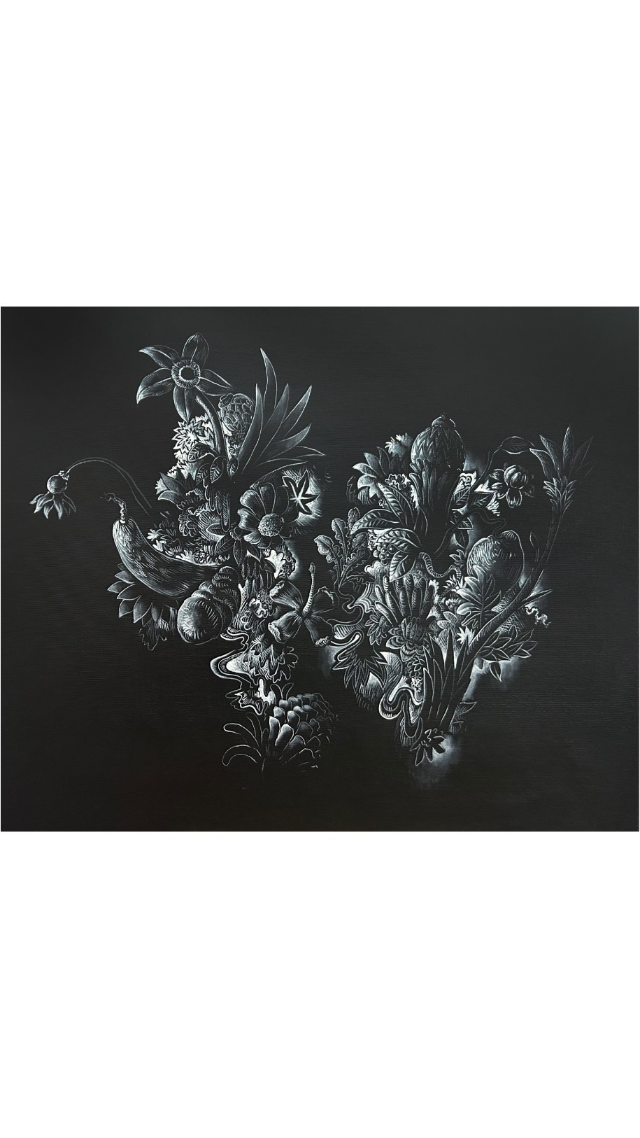 As sutis interferências no branco da parede ecoam por toda a exposição. O contraste entre pretos e brancos aparece em diferentes escalas — nas superfícies recortadas, nas pinturas em que tinta preta e branca se alternam sem se misturar, e nos tons de cinza que habitam o espaço entre ambos.