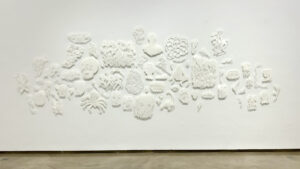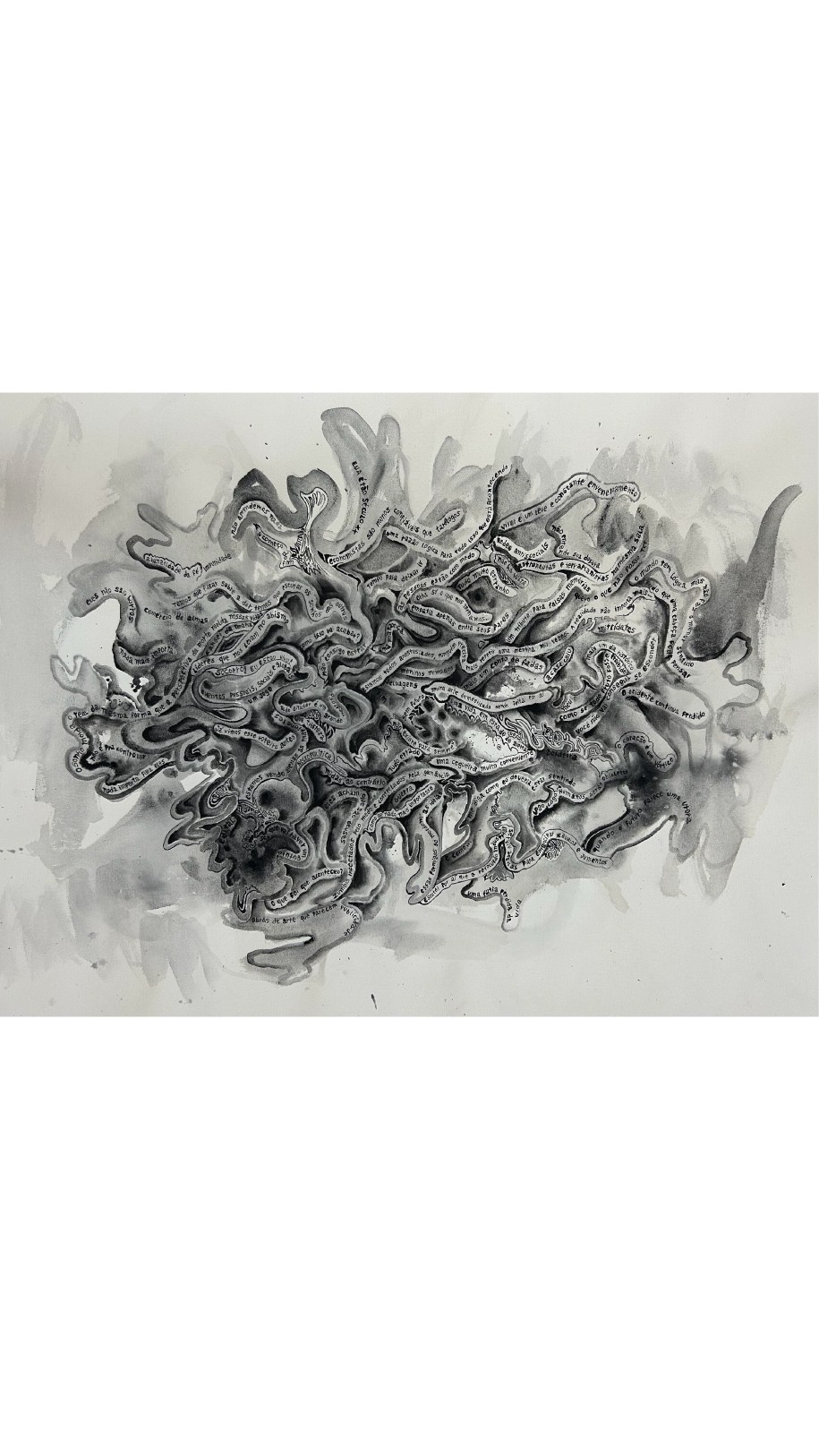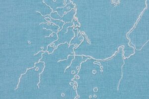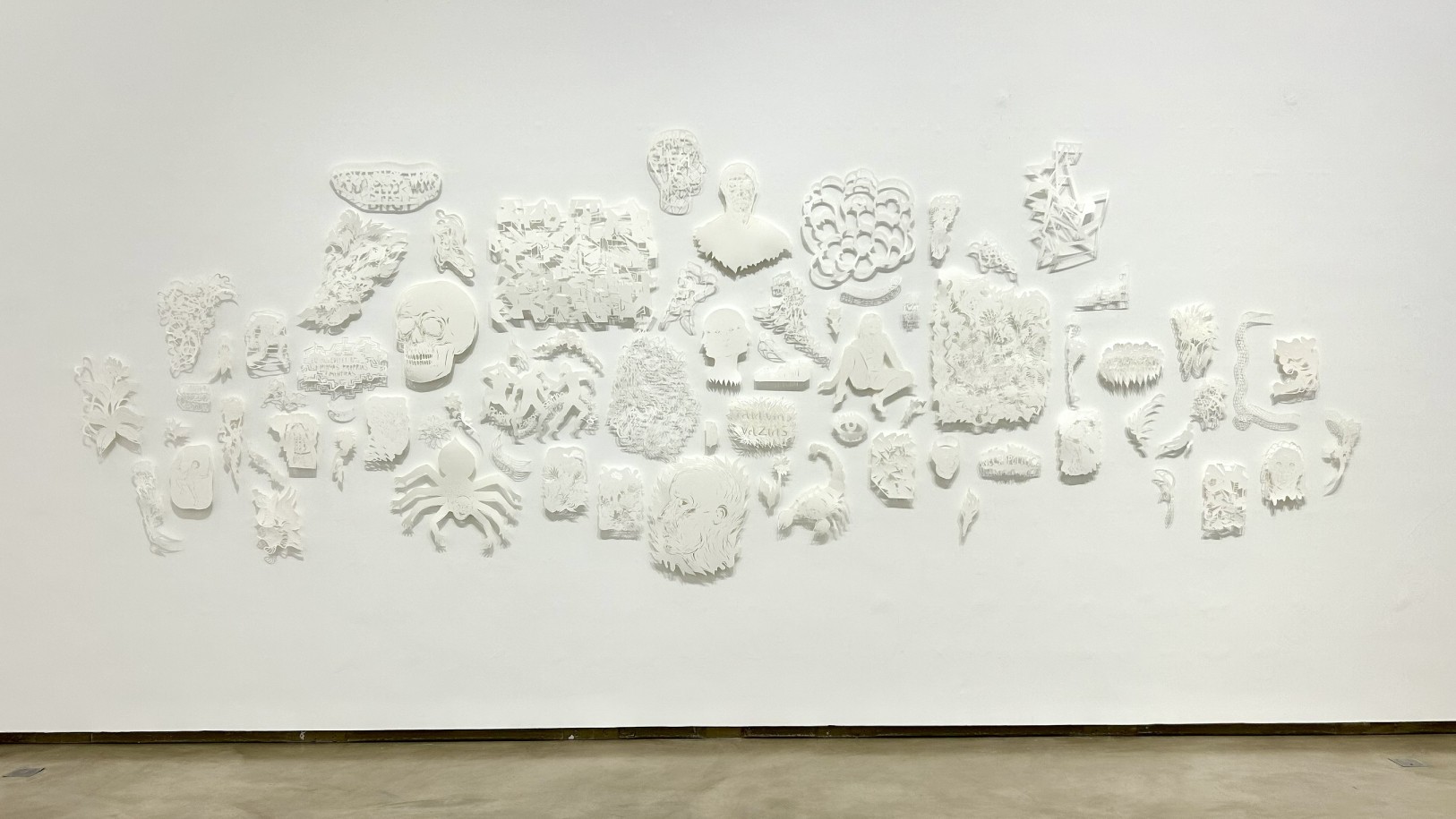 Numa época de excessos, o visitante é surpreendido com um jogo mimético branco sobre branco no espaço central da galeria. Arquipélago, instalação inédita composta por papéis recortados e fixados com alfinetes, projeta sombras sobre a parede, criando um delicado antagonismo entre presença e ausência. São desenhos feitos com estilete, nos quais o gesto do corte substitui o traço, e o vazio se torna linguagem. Uma proposição de quietude, em contraposição ao turbilhão de estímulos da vida contemporânea.