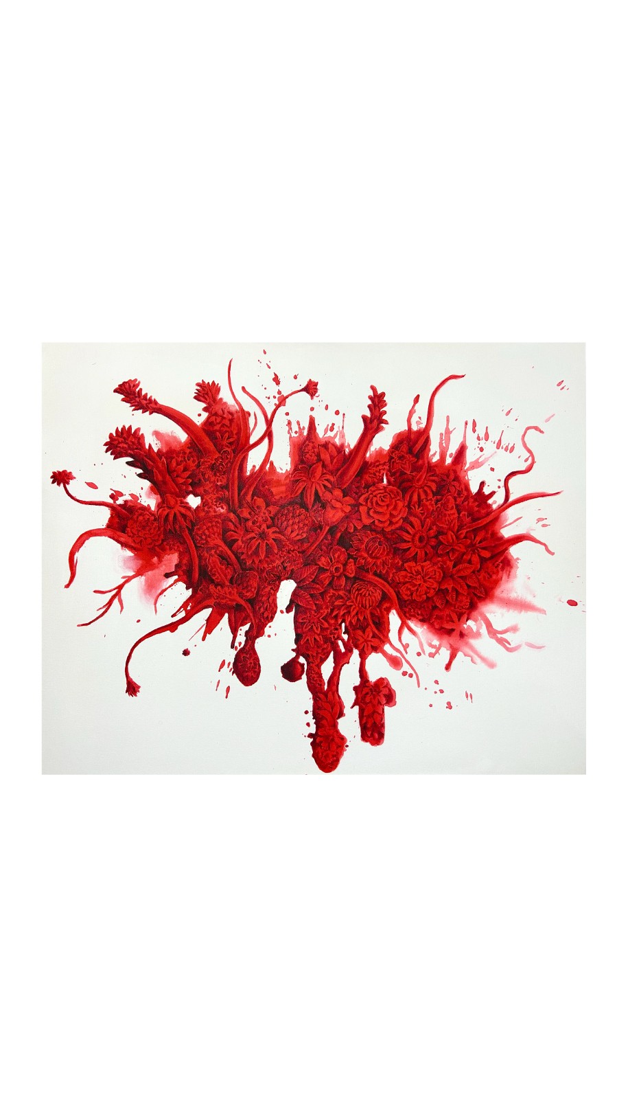 Numa outra vertente, aparições mais humanas e serenas surgem, personificando o ser por trás do turbilhão de pensamentos. Ora com o olhar absorto em reflexões existências, que fluem no entorno como um rio; ora de olhos fechados, como que em transe meditativo, mergulhado num vermelho-sangue de proposição ambígua: dar a ver a vitalidade que pulsa nas veias e o aspecto visceral, quase gore, de uma subjetividade em crise. Inquietação pujante, num espaço em que o plácido e o perturbador coexistem.